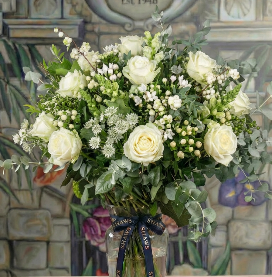 This stunning White Dazzle handtied bouquet is perfect for adding a touch of sophistication to any occasion. The striking white blooms have been carefully arranged in a stylish bouquet to create a look that is both elegant and timeless. This bouquet is sure to make an impact, with an exquisite combination of white roses, white astible, white astrila and white snap dragons. Send this classic beauty to add a touch of class to any occasion.